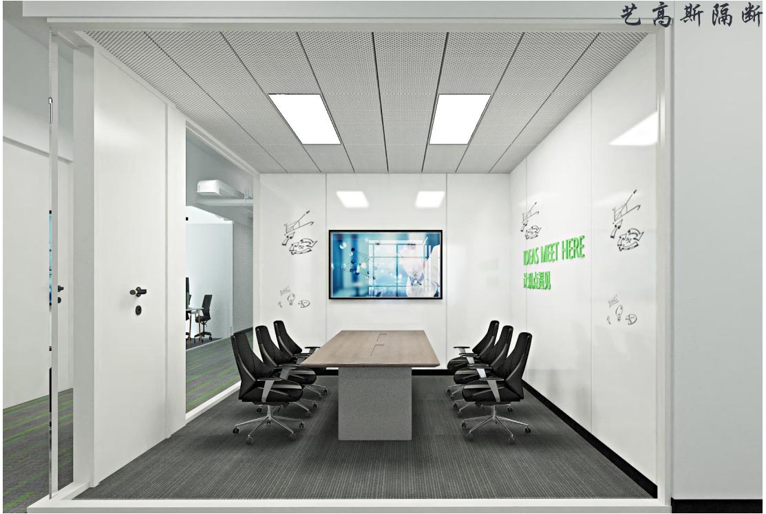而對于會議室這種需要一定的隱秘性的場所,則加上一層磨砂,不但保持著通透明亮大氣的特質(zhì),還額外帶有私密性和莊嚴性,并且,良好的隔音可以讓玻璃前后的工作人員不會互相受到干擾。