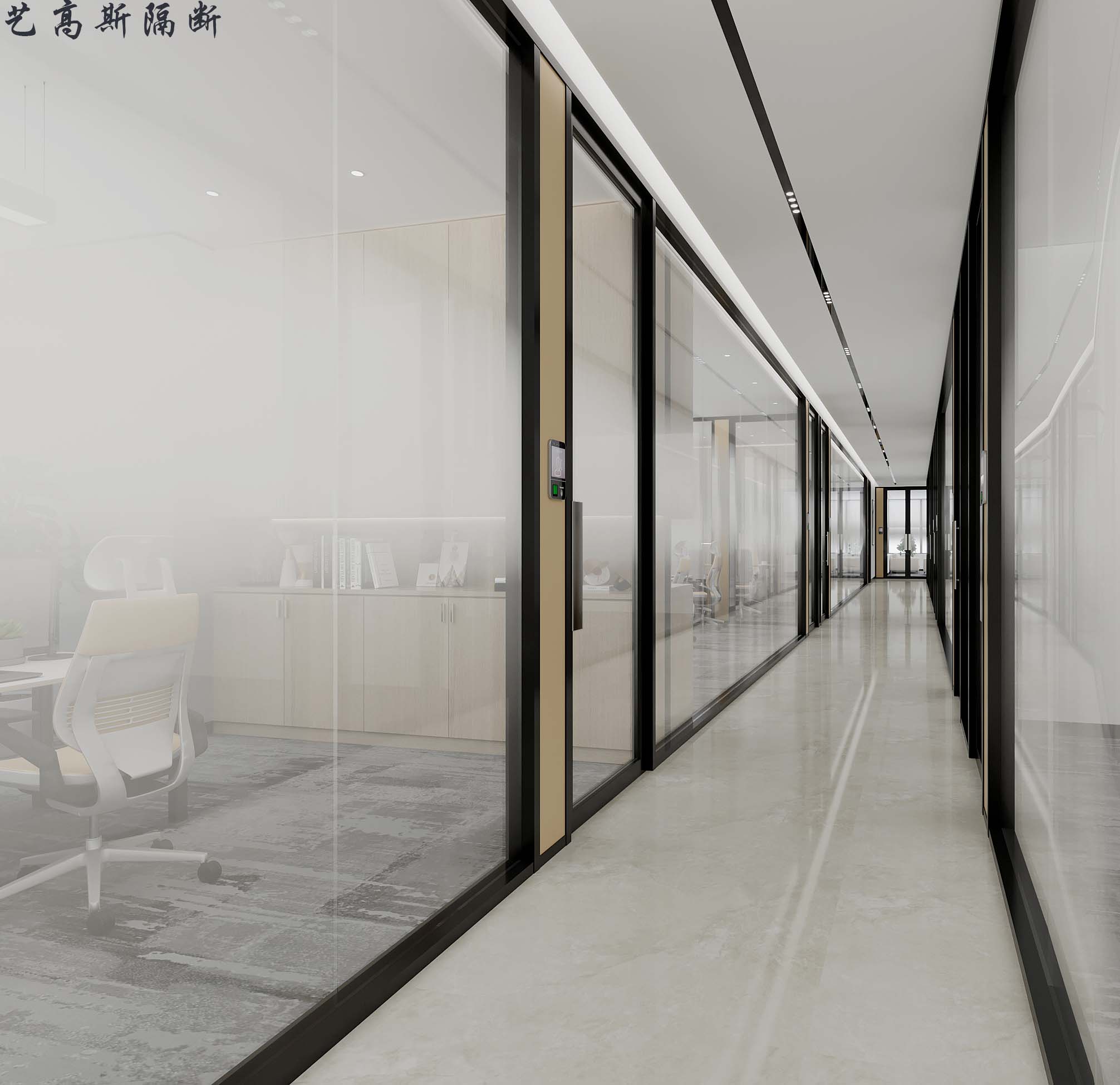 個人認為全景玻璃隔斷適合面積比較大的辦公場景,這次案例采用了黑色的邊框搭配全景玻璃,配合灰白色系的地板,整體風格顯得十分的有格調,寬敞通透、美觀時尚的辦公環境一攬無余。玻璃門邊加裝木紋色設備帶,不僅讓色彩有了跳躍,避免視覺疲勞;并且能更好的滿足功能需求。